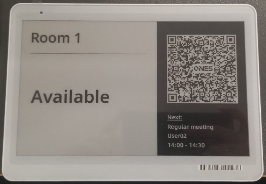 In this status, the theme of the ePaper device is black and it is available to book. The ePaper device will show the resource name, status color, next meeting information and the QR code for walk-in.