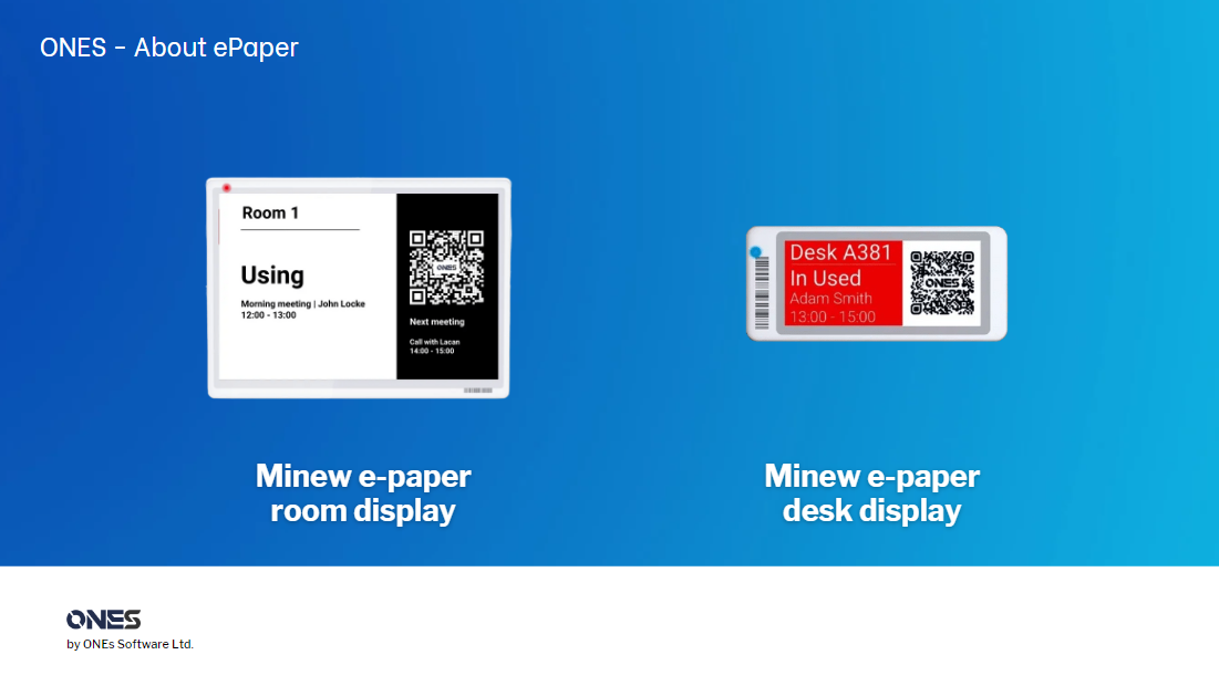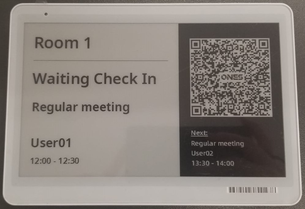 ONES support ePaper to let user via the ePaper to book the resource. The resource status can be displayed on the ePaper to let users know the room or desk whether is available, waiting check-in or in using.