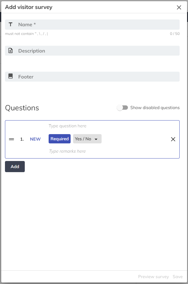 Visitor survey collects the information of visitor upon pre-registration/check-in. Each survey SHOULD be assigned to Visiting Purpose which will be presented if that visiting purpose is selected in the visitor appointment.