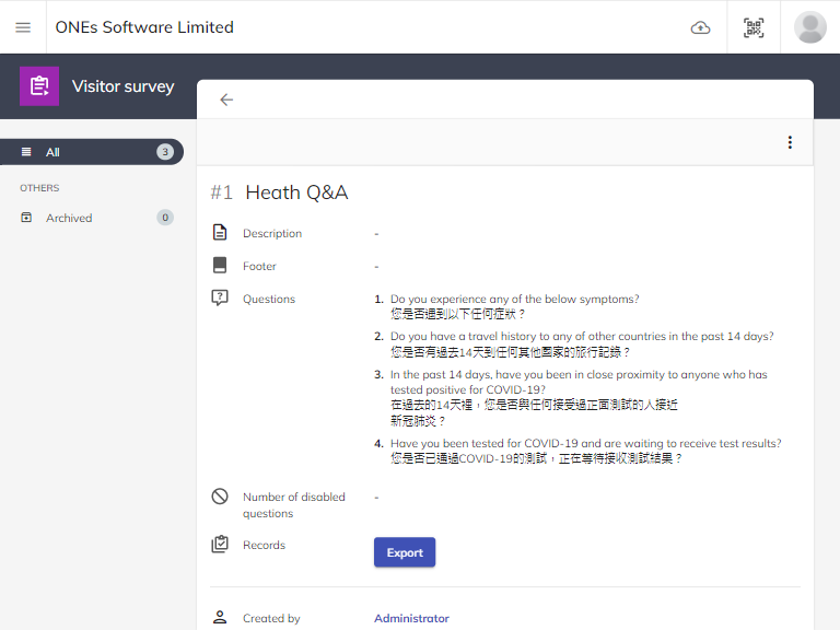 The survey need to be filled when the visitor check-in in the self check-in kiosk, or in the pre-check-in process via email. Receptionists can also help to fill in the survey when they help the visitor to check-in in the web-app.