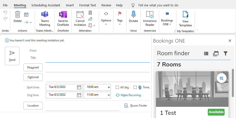 The Bookings ONE outlook add-in including the following features for meeting in the calendar page: