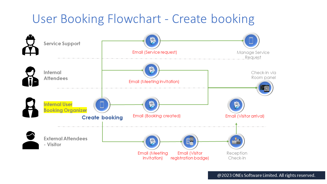 - "Visitor arrival" email to the booking organizer when the external attendees (visitors) arrive and check-in in reception;
