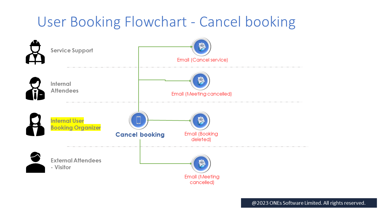 - "Meeting cancelled" email to the external attendees as visitor (if any);