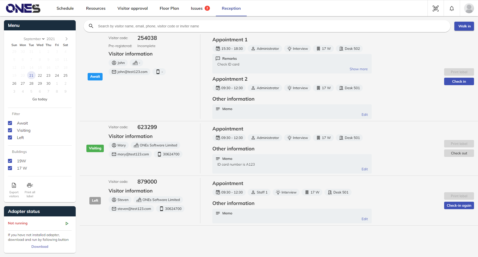 You will be able to see the visiting information, such as inviter, visiting period, locations, visiting purposes, and visitor’s information in reception page. Those information will be automatically recorded for administrators to conduct visitor management and analyses.
