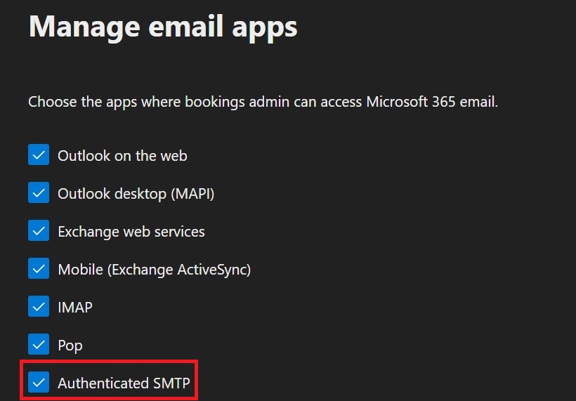 ONES が Office 365 SMTP サーバーに接続できない場合は、メール アプリケーションの設定を確認し、「認証済み SMTP」を有効にしてください。