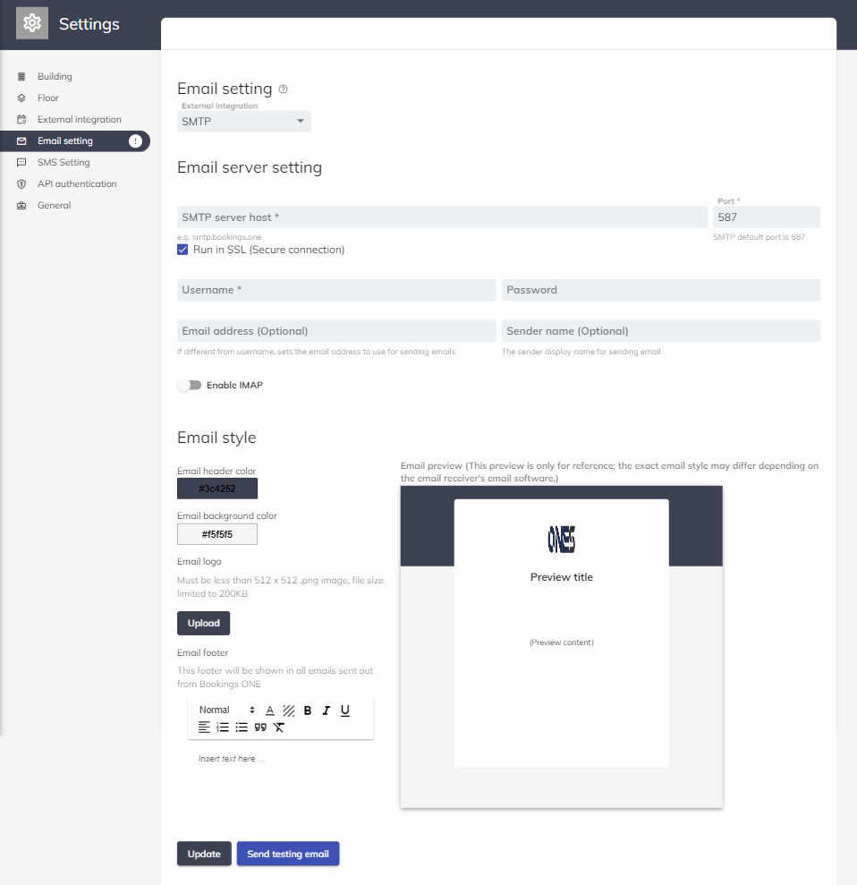 電子メール サーバーの設定は、ONES から電子メールを送信するため、または出席者からの返信電子メールを受信するために電子メール サーバーを構成するために使用されます。