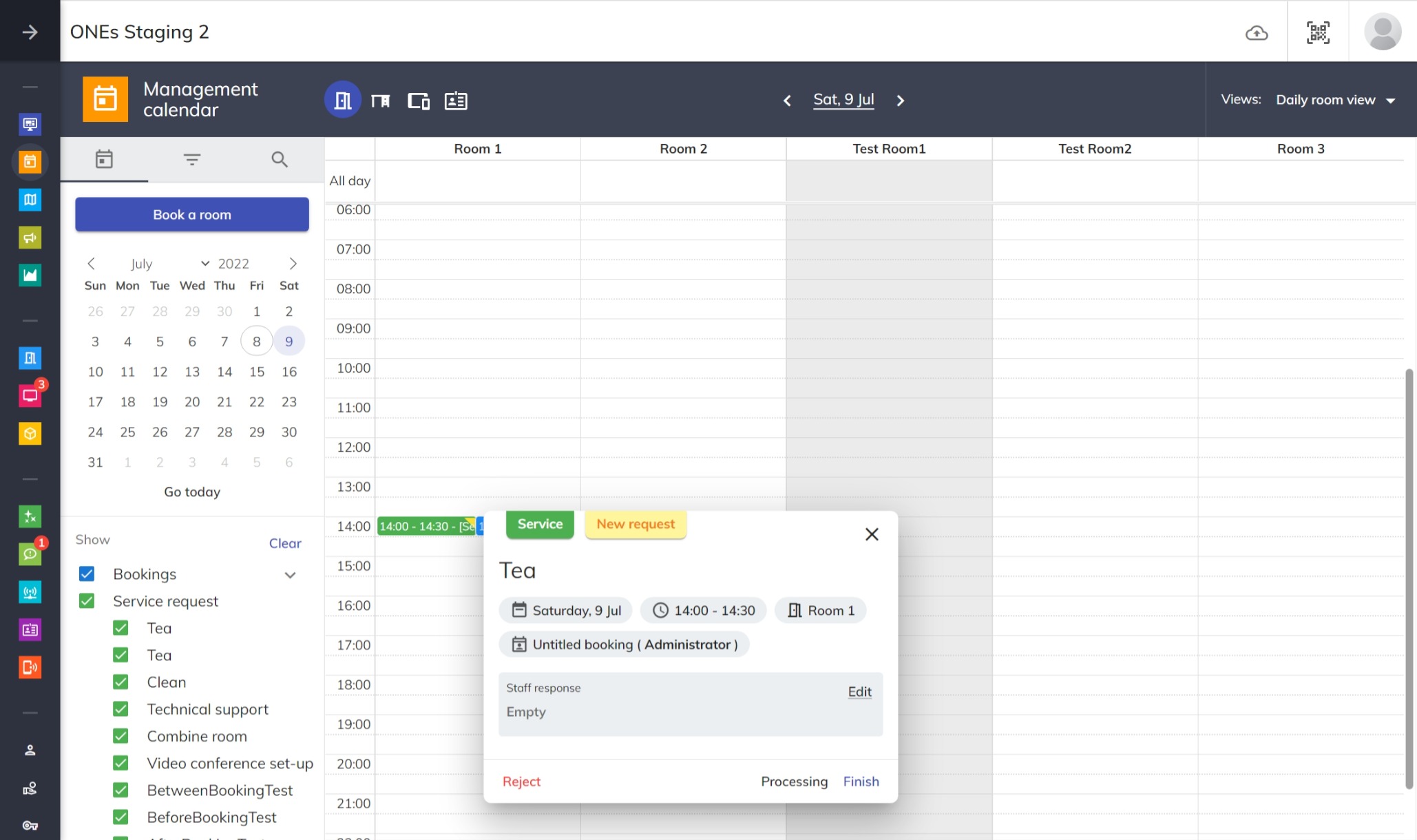 予約管理カレンダーで、サービス 管理者は サービス リクエストをクリックしてダイアログ ボックスを開いて、サービスの詳細情報を見つけることができます、例: 場所、日付、時間、スポンサー、備考。 「新しいリクエスト」 では、誰かがサービスに取り組むまで、サービス リクエストの右上隅に黄色のラベルが表示されます。