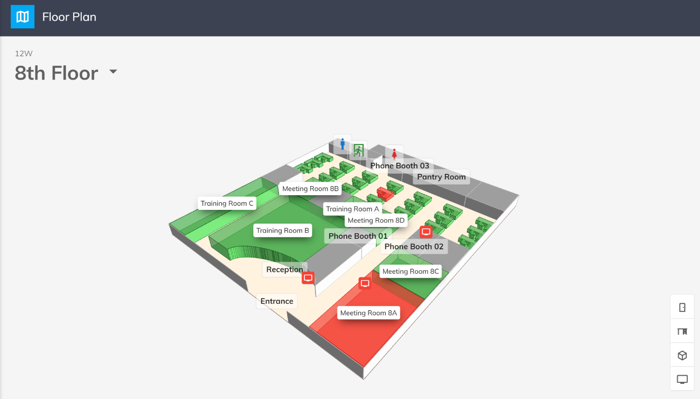 柔軟性を向上させるために、間取り図に変更/修正を加えたい場合は、2D 間取り図 ファイルを変更してマップ エンジンに再アップロードするだけで済みますが、リソースを再マッピングする必要があります。ルームなどの間取り図に再構成します。 リソースに関連する予約と資料は影響を受けません。