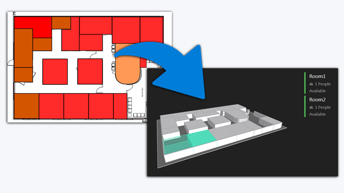 間取り図は、オフィスの直感的な構造をユーザーに提供します。 ルーム、デスク、設備などの間取り図にリソースを設定できます。 リソース、端末 の場所をユーザーに知らせるために、間取り図に表示されます。