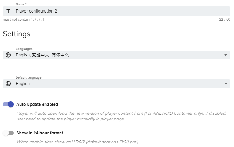 - 自動更新の有効化: 端末は新しいバージョンの端末 コンテンツ (Android および Windows 用) を自動的にダウンロードします。無効にした場合、ユーザーは端末 ページで端末を手動で更新する必要があります。