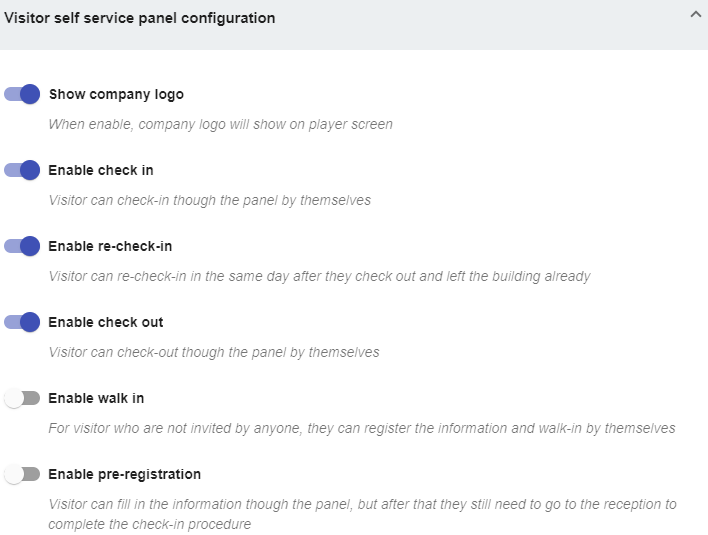 - プレーヤーの上にウォークイン: この設定が選択されると、来客臨時訪問フォームが来客セルフサービス端末に表示されます。