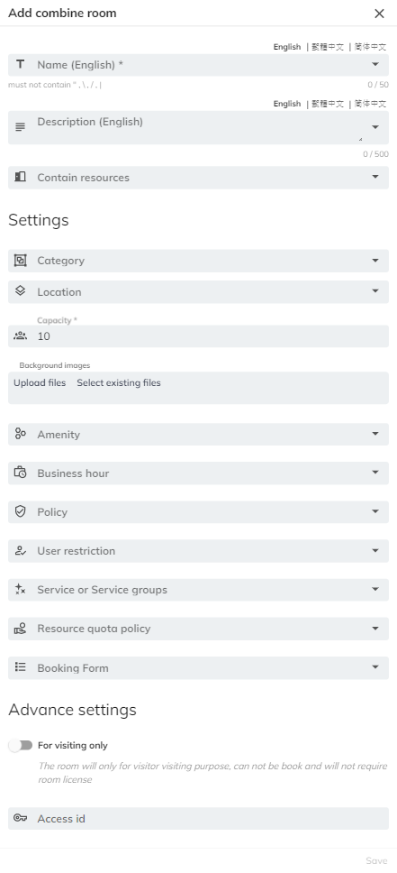 管理ページ -> リソース -> ルームコンバインルームは、複数のルームを組み合わせた機能を備えたリソースの一種です。コンバインルームが予約されている場合、組み合わせられたルームを個別に予約することはできません。