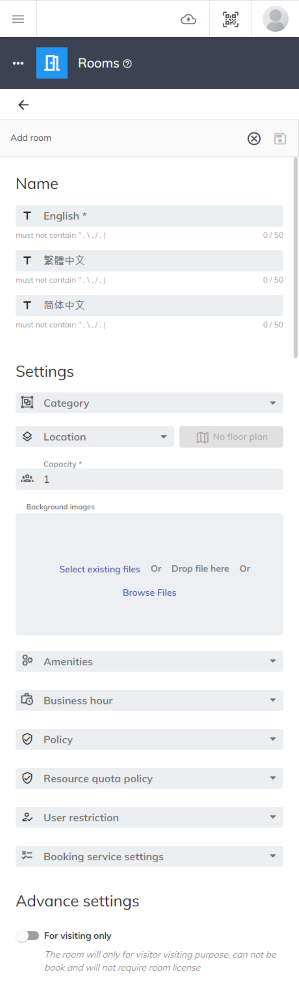 - 名前: ルームの名前を英語、繁体字中国語、簡体字中国語で入力します。 英語名は必須フィールドです。