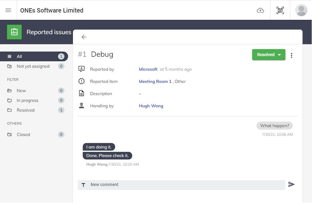 すべてのユーザーは、ユーザー APP および ルーム・デスク ディスプレイ端末 の問題を報告でき、サポート 管理者は管理ページでそれを管理できます。