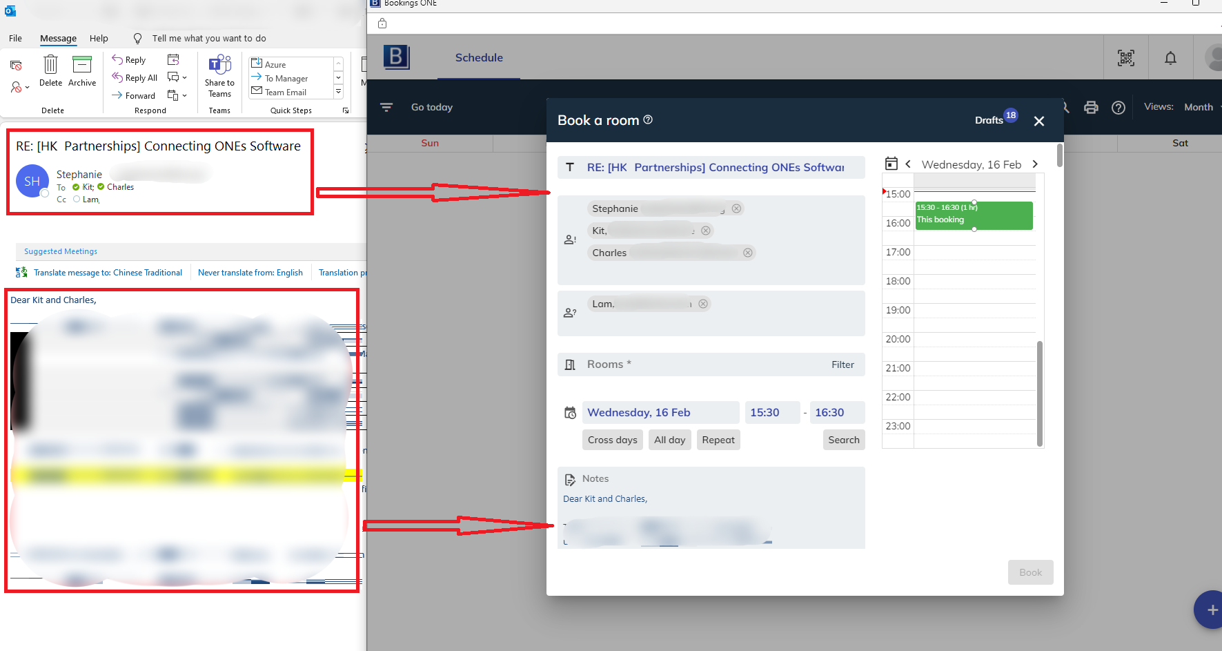 - 電子メールの内容を添付: これは、ルームの予約を作成するのに役立ちます。 ルームの予約が作成されると、会議の参加者に確認メールが送信されます。
