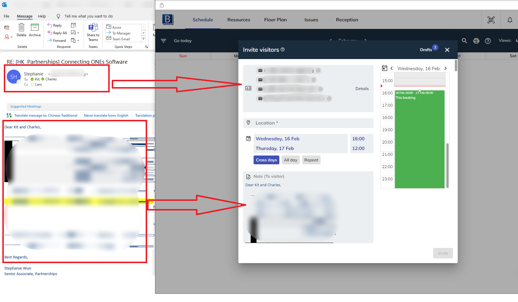- 電子メール コンテンツの添付: これは、電子メールのタイトル、送信者/受信者の電子メール (ゲストとして) など、電子メールの情報に基づいて招待状を作成するのに役立ちます。 招待状が作成されると、確認メールが来客に送信されます。