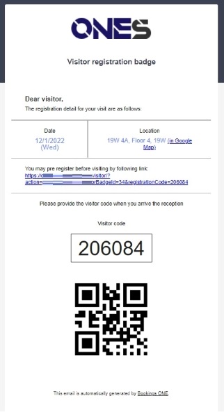来客は、事前登録リンク (来客管理設定で有効になっている場合) と到着時にチェックインするための QR コードを含む、来客バッジが記載された電子メールも受け取ります。 このメールの送信時間は、管理コンソールの来客管理設定に基づいています。