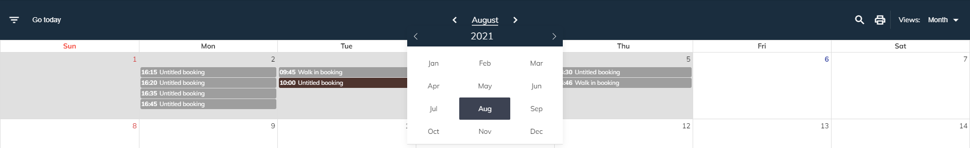 カレンダーには月ごとのスケジュールが表示されます。 週末を表示するかどうかを選択できます。 カレンダー ボタン は月ごとに表示されます。