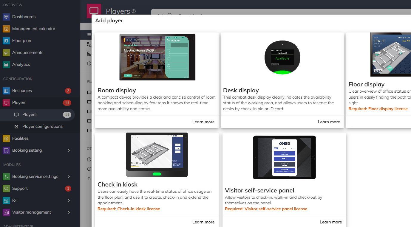 管理頁面。 去到管理頁面 > 播放器 > 點擊 + 按鈕 - 選擇與該播放器關聯的顯示器類型(例如房間顯示器/樓層顯示器等)