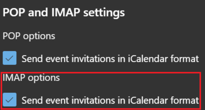 如果您想使用 IMAP,您需要在“POP 和 IMAP 設定”的“IMAP 選項”中啟用“以 iCalendar 格式發送活動邀請”。