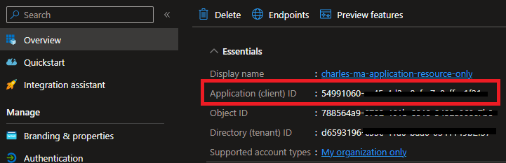 概觀並將值:應用程式 (用戶端) 識別碼和目錄 (租用戶) 識別碼複製到相應的字段中。
