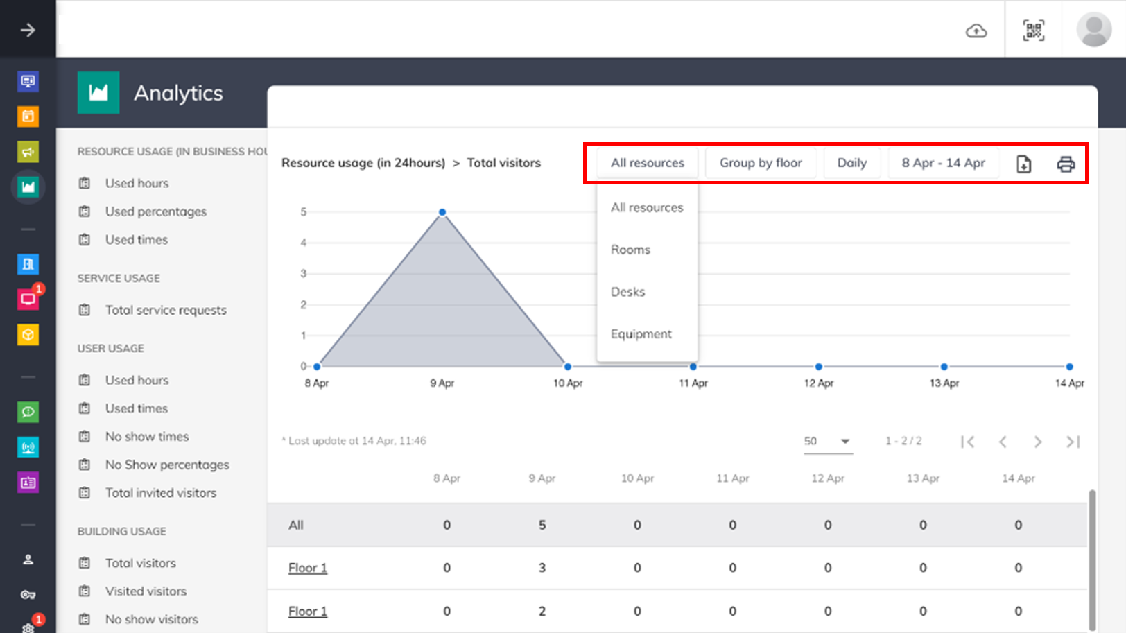 分析系統專為管理者而設計,可從多個方面概述實時數據:(1) 資源使用情況、(2) 服務使用情況、(3) 用戶使用情況、(4) 大廈使用情況。