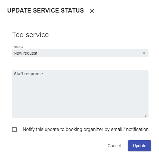 編輯按鈕打開對話框並輸入服務的回應。通過電郵/推送將此更新通知發起人: 如果啟用,更新服務狀態和回應將通過電子郵件和系統通知發送給發起人。
