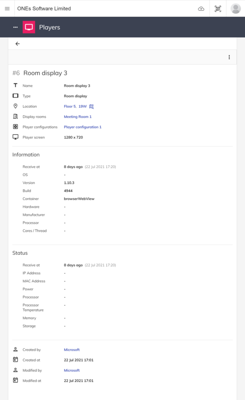 在"播放器"頁面,播放器管理者會看到播放器資訊,例如名稱、狀態和授權。