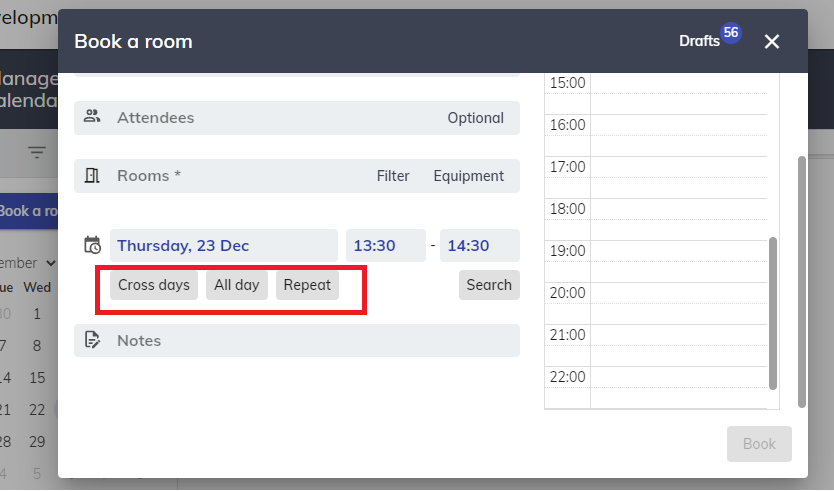 啟用此設定後,用戶可以跨日創建預約。例如,您可以從 5 月 5 日晚上 11:55 到 5 月 6 日凌晨 1:00 開始預約房間。