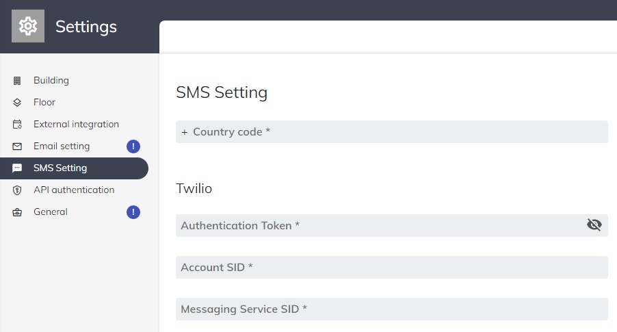 此頁面是關於短信(SMS)的設定。當訪客者訪客只提供電話號碼(沒有輸入電子郵件地址)時,將發送短信以取代電子郵件。短信包括邀請(創建、編輯、刪除)和訪客證。