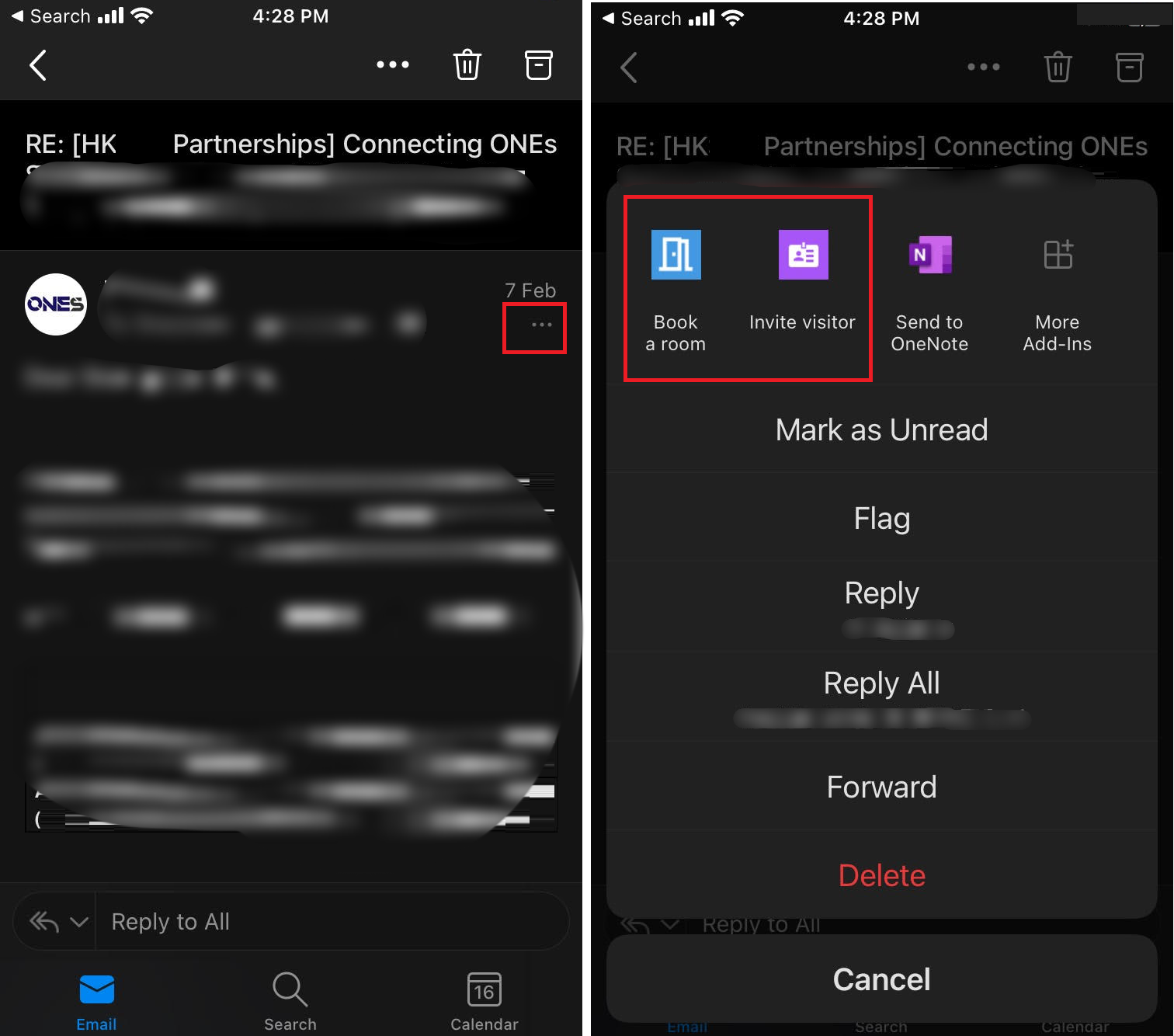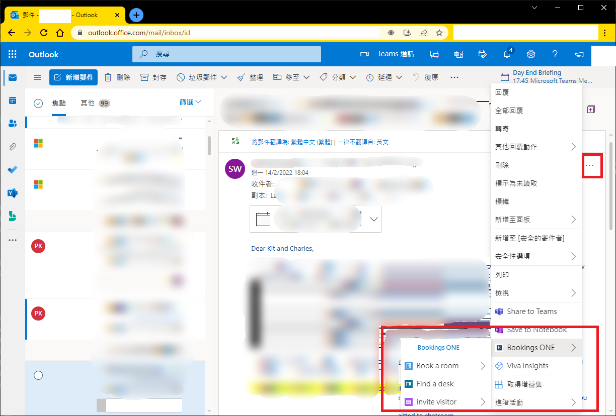 Bookings ONE Outlook 加載項 (Add-in)包括以下用於在郵件頁面中進行會議和訪問的功能: