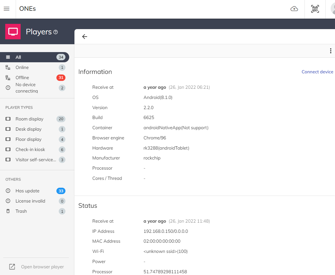 播放器是連接到ONES伺服器的終端。用戶可以在不同的播放器設備上查看辦公室狀態、登入、結束或延長預約。 有幾種類型的播放器用於不同的目的: