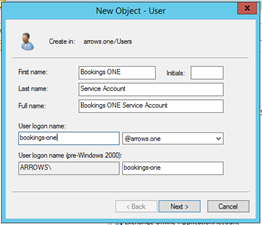 1. Add service account user for Bookings ONE to active directory