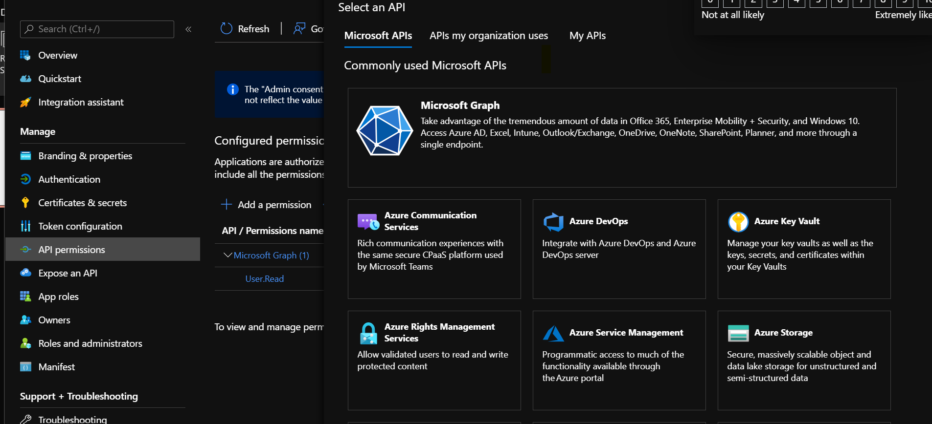 API Permissions, clickAdd a permission, selectMicrosoft Graph