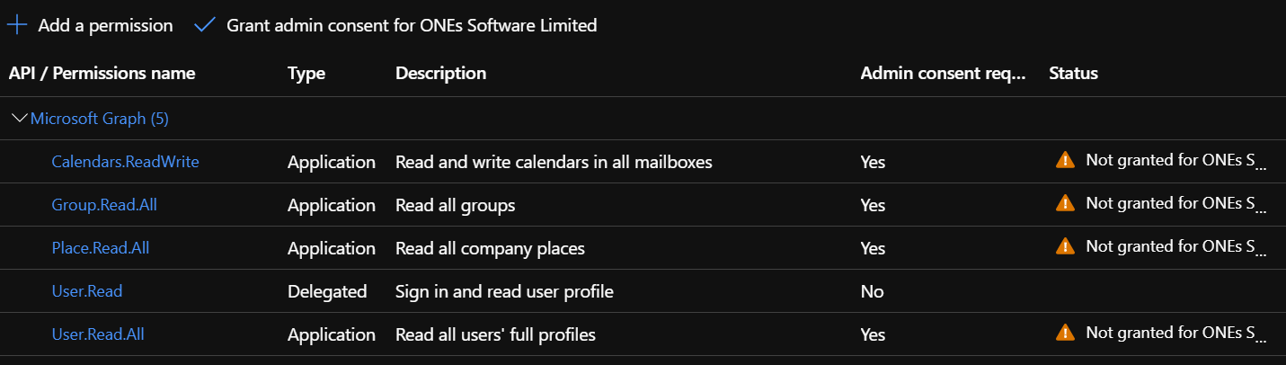 You will see the permissions added to the list but there are a warning Not granted for {Your organization name} in status. Now you have to click the