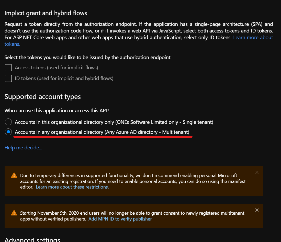 Authentication, inSupported account types, selectAccounts in any organizational directory(Any Azure AD Directory - Multitenant, and click Save button